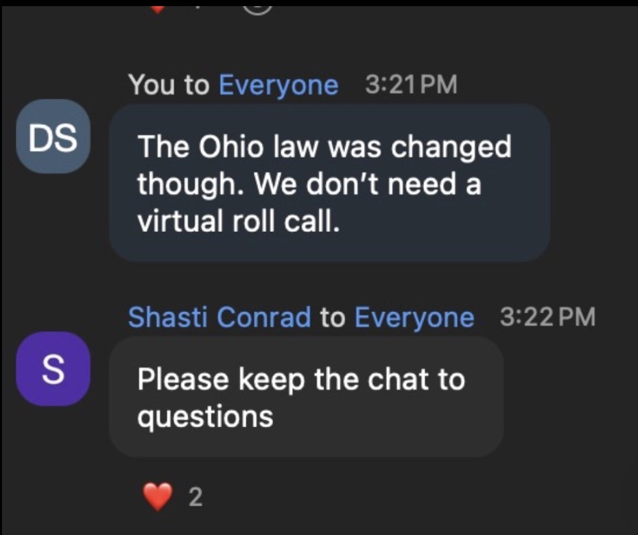 This screenshot below is from the chat on our July 13 WA delegate Zoom call, during which Shasti Conrad, the Chair of the Washington State Democratic Party and current Vice-Chair of the DNC, informed us that we’d be nominating Biden by virtual roll call before the in-person convention in Chicago. I pushed back, and was shut down.