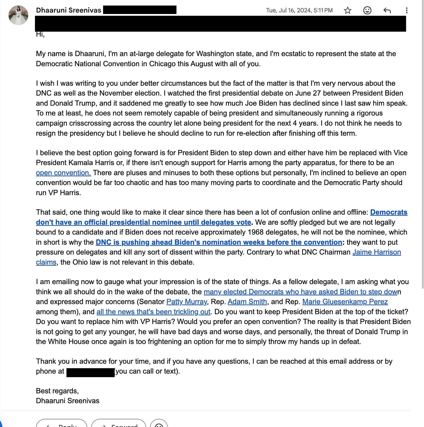 The replies I got ranged from reluctantly agreeing, to insisting Kamala Harris couldn’t win because she was a woman, to calling me (a woman of color) a racist misogynist for suggesting that Harris (a biracial woman) replace Biden (a white man) as the Democratic nominee. But, not a single one of the other 100+ WA delegates was willing to publicly oppose Biden as the nominee.
