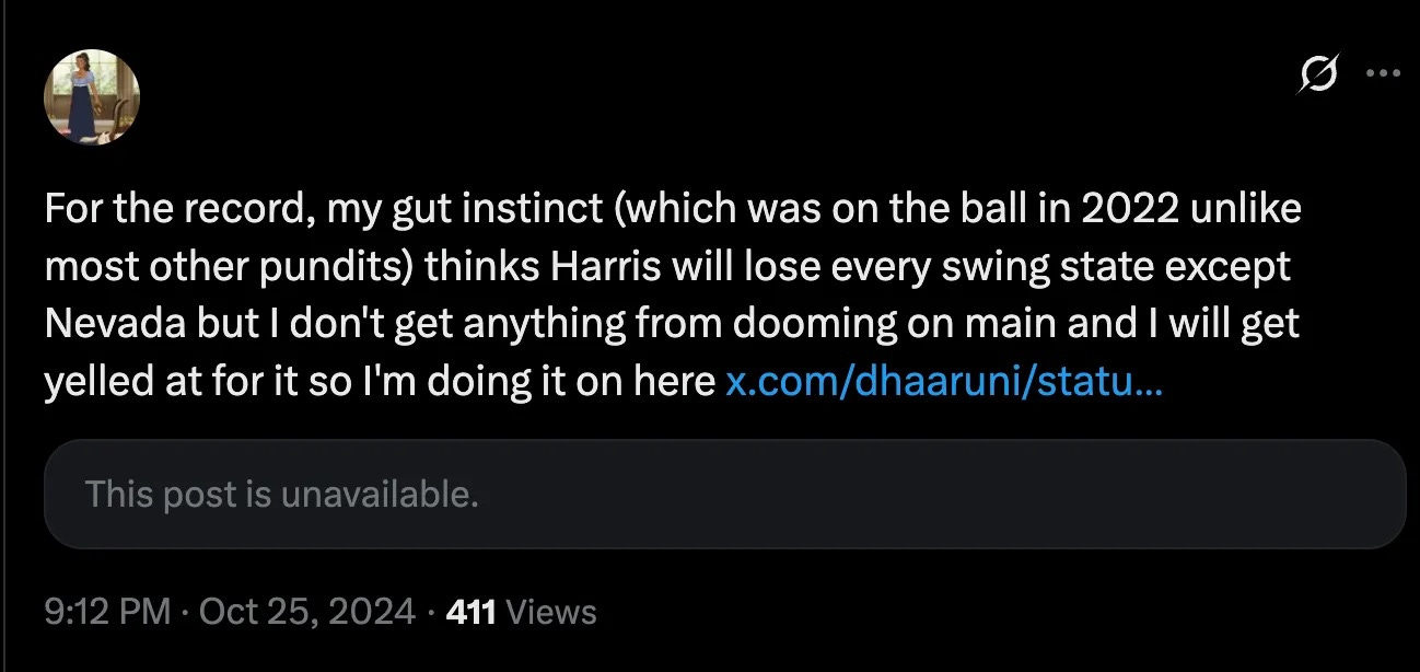 To be clear, I knew Harris would lose even before she was the nominee (see above post on alt). But, I believe the internal polling I saw which showed Biden would have lost by much more; he was trailing Trump in New Jersey, and massively dragging down House and Senate Democrats. I trust the polling, even if I take the punditry with a massive grain of salt.