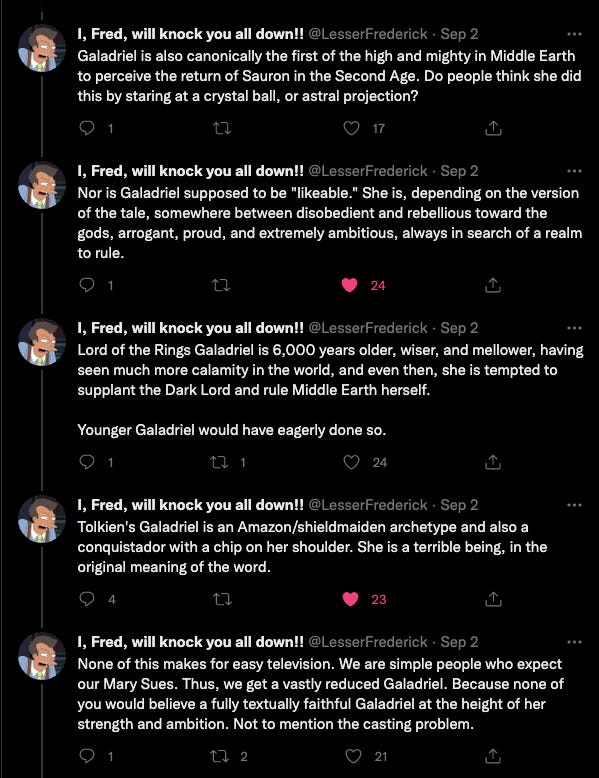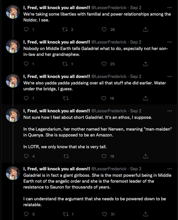 The Lord of the Rings: The Rings of Power: I’m following @LesserFrederick’s takes on the show on Twitter, which I honestly like better than the show itself but I’ve only seen the first episode so I’m hoping it picks up with the next episode.