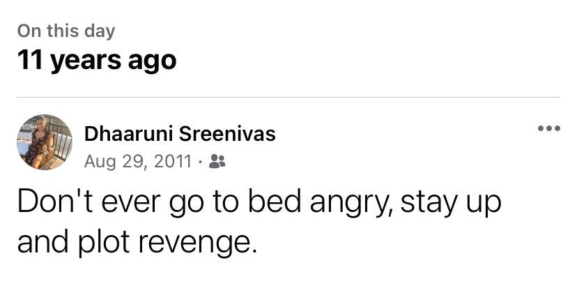 I’m very glad my parents raised me to be angry in a way most like, young millennial women of color weren’t taught to be. I was talking to my friend Maya and I was like, if I had to pick a negative sentiment I embody, or a 7 deadly sin, it would absolutely be wrath. I’ve completely mellowed out since I was rage-posting on Facebook as a 16-year-old, but nonetheless, my core remains the same.