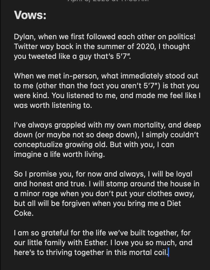 My vows were great, simple and poignant and only mention death twice, which is actually really impressive for me.