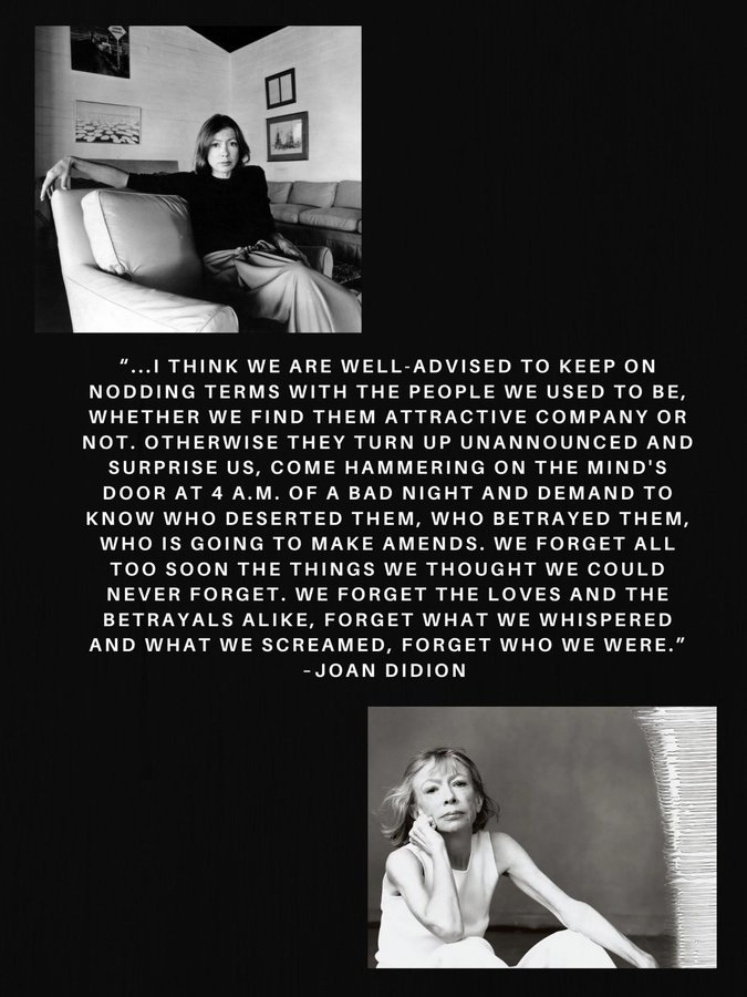 The thing about Joan Didion (slash Dhaaruni) haters is that a lot of people don’t respect intentional discipline in women because they’re resentful they’re unable to possess it. As a young woman who takes herself extremely seriously, and is harsh and prideful at times in a way that's almost masculine but doesn't have the male privilege to embrace it, Joan Didion's work has always deeply resonated with me at my best and my worst, and I'll miss her.