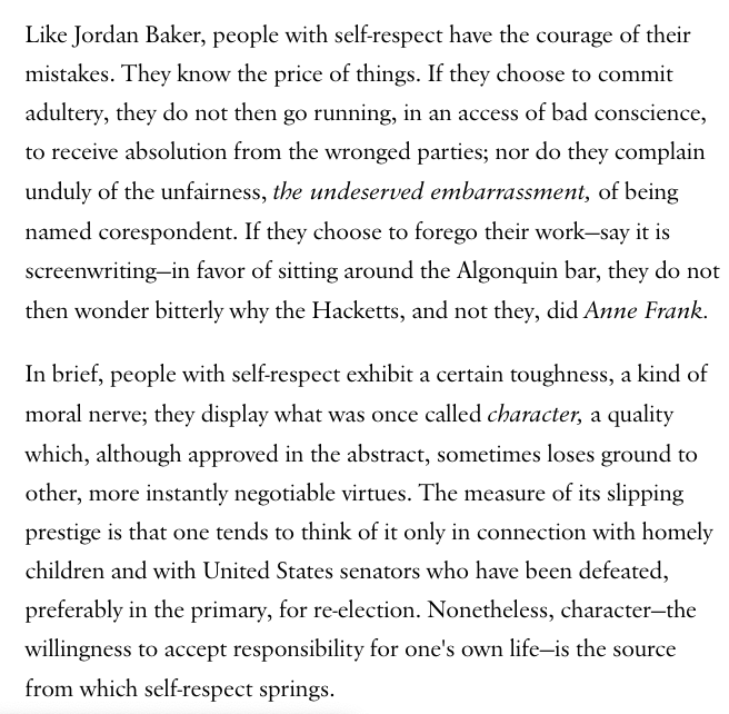Didion's "On Self-Respect" is a piece of writing that I believe made me who I am and which I regularly return to; I'm not sure what that says about me, but I know it says something.