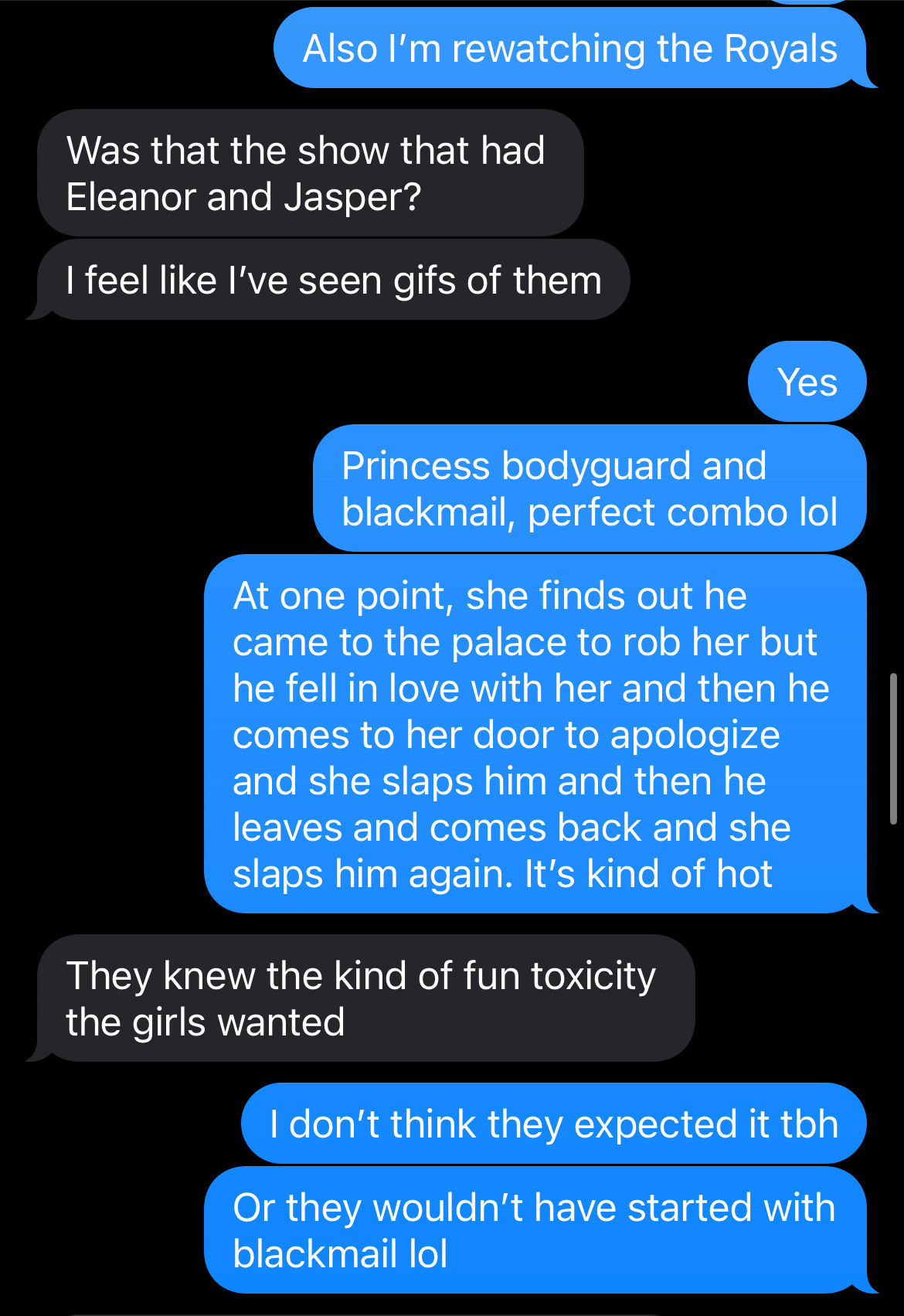 You know how the British Royal Family (BRF) wasn’t a fan of The Crown? I don’t remember what they said about The Royals if anything, but given that this fictional adaptation of the BRF is … not very flattering, I wouldn’t comment either. That said, between Queen Helena (played by Elizabeth Hurley, who Hugh Grant cheated on with a sex worker named Divine Brown back when I was an infant5) hooking up with her daughter, Princess Eleanor’s, bodyguard/boyfriend, Jasper, who’s sort of blackmailing her, and the antics of Princes Robert (faking his own death and maybe murdering his own father) and Liam (dating his brother’s girlfriend) and Eleanor (drugs, bisexuality, and aforementioned bodyguard), the show was great fun. Plus, I’ve always been very into the princess/bodyguard romance trope, which is in the queen/knight and its darker version, queen/huntsman family of romance tropes6. I would say I doubt the show creators would have leaned into the blackmail aspect if they’d realized from the beginning that Jaspenor was the best part of the show, but uh, given that the show creator is Mark Schwahn, I’m not sure about that.