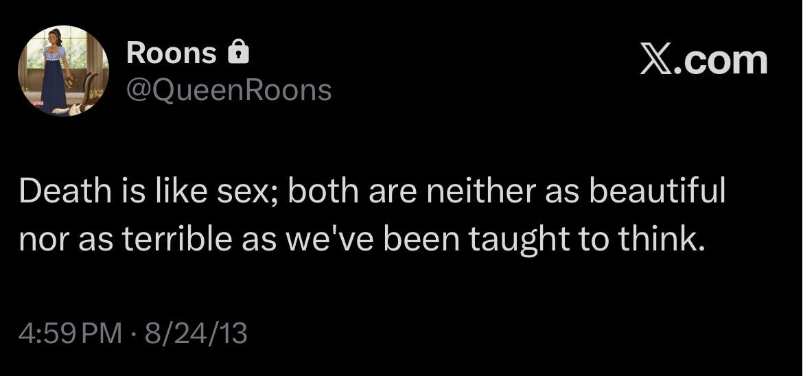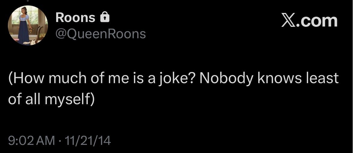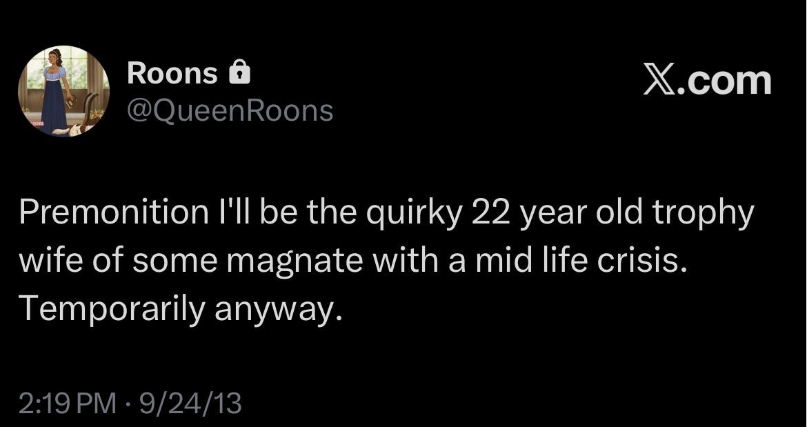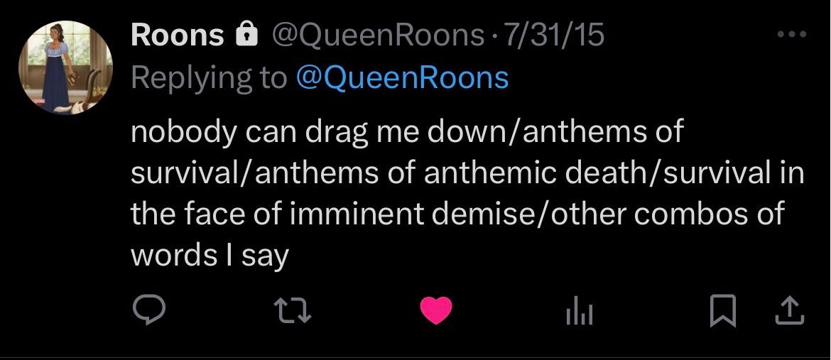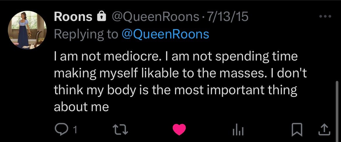 I’ve been going through my old Twitter posts and it’s interesting because I almost forgot who I used to be. I don’t want to RVTRN to that version of me, but I think it can be healthy to navel gaze (as a treat). Yes, everybody thinks way too much about themselves8, but sometimes, in order to go forward, you need to go back. I’m not the same person who made these posts anymore, but I am a better version of her, and I’m proud of it.9